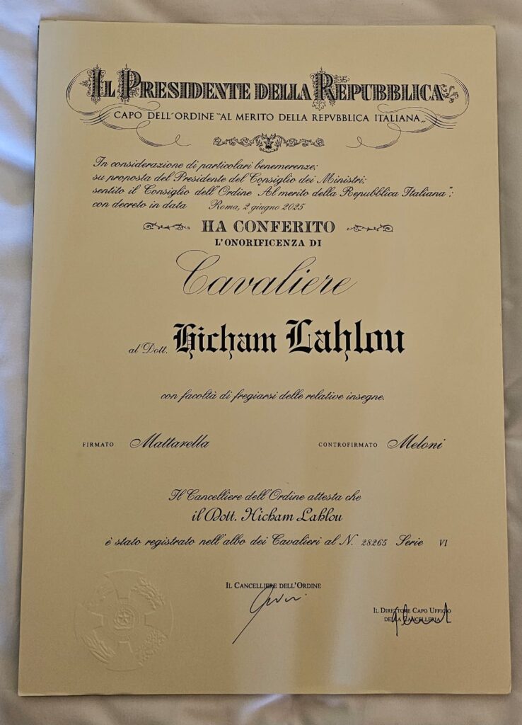 Hicham Lahlou Honored with Italy’s Highest Civil Distinction