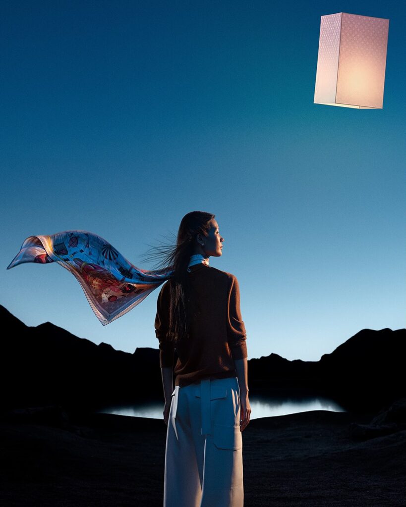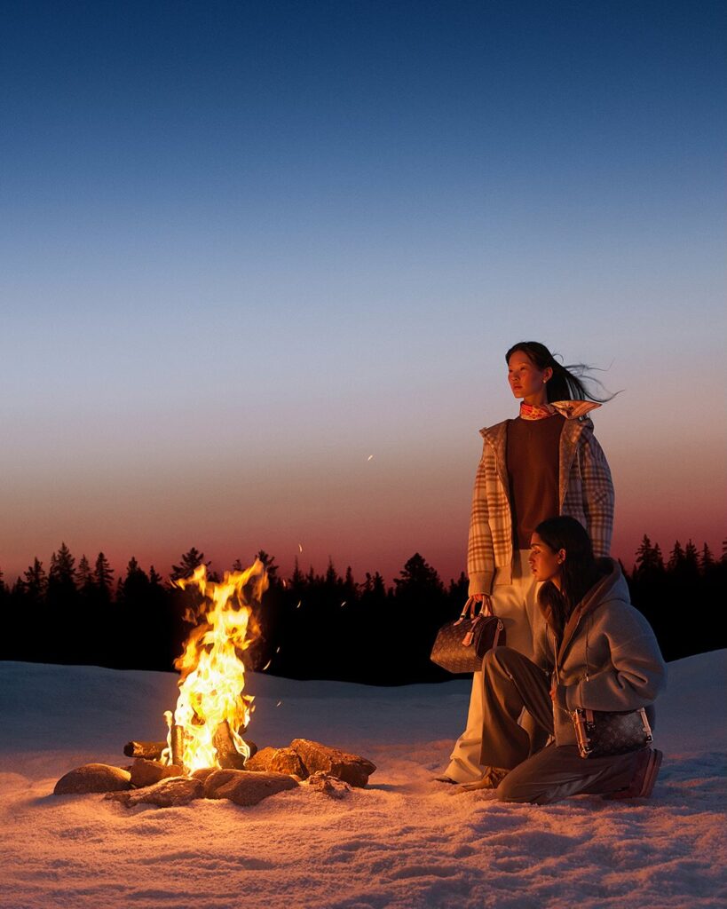 Rooted in Asnières, the birthplace of Louis Vuitton’s historic ateliers, the narrative opens with a symbolic gesture: a golden lantern emerging from a Malle Courrier, the emblematic trunk that represents the Maison’s legacy of exploration. This lantern becomes a guiding light, carrying the viewer from Paris to dreamlike destinations where imagination flourishes. The City of Light serves as the starting point for an enchanting voyage that extends to polar landscapes illuminated by auroras, fireside gatherings and serene frozen lakes.