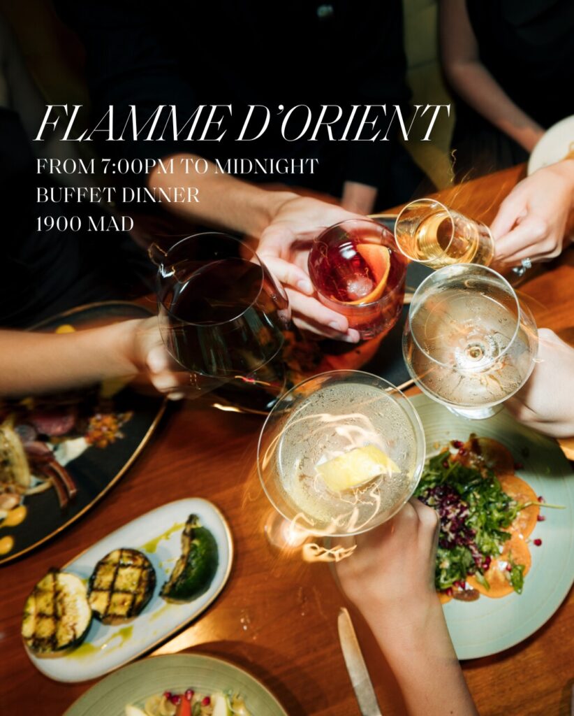 For a more festive and generous atmosphere, Flamme d’Orient hosts a lavish buffet dinner from 7:00 PM to midnight. Celebrating the richness of Oriental and international flavors, the buffet is designed for sharing, discovery, and abundance. Live cooking stations, vibrant dishes, and a warm ambiance make Flamme d’Orient an ideal choice for groups and families looking to celebrate together. The New Year’s Eve buffet dinner is available at 1900 MAD per person.