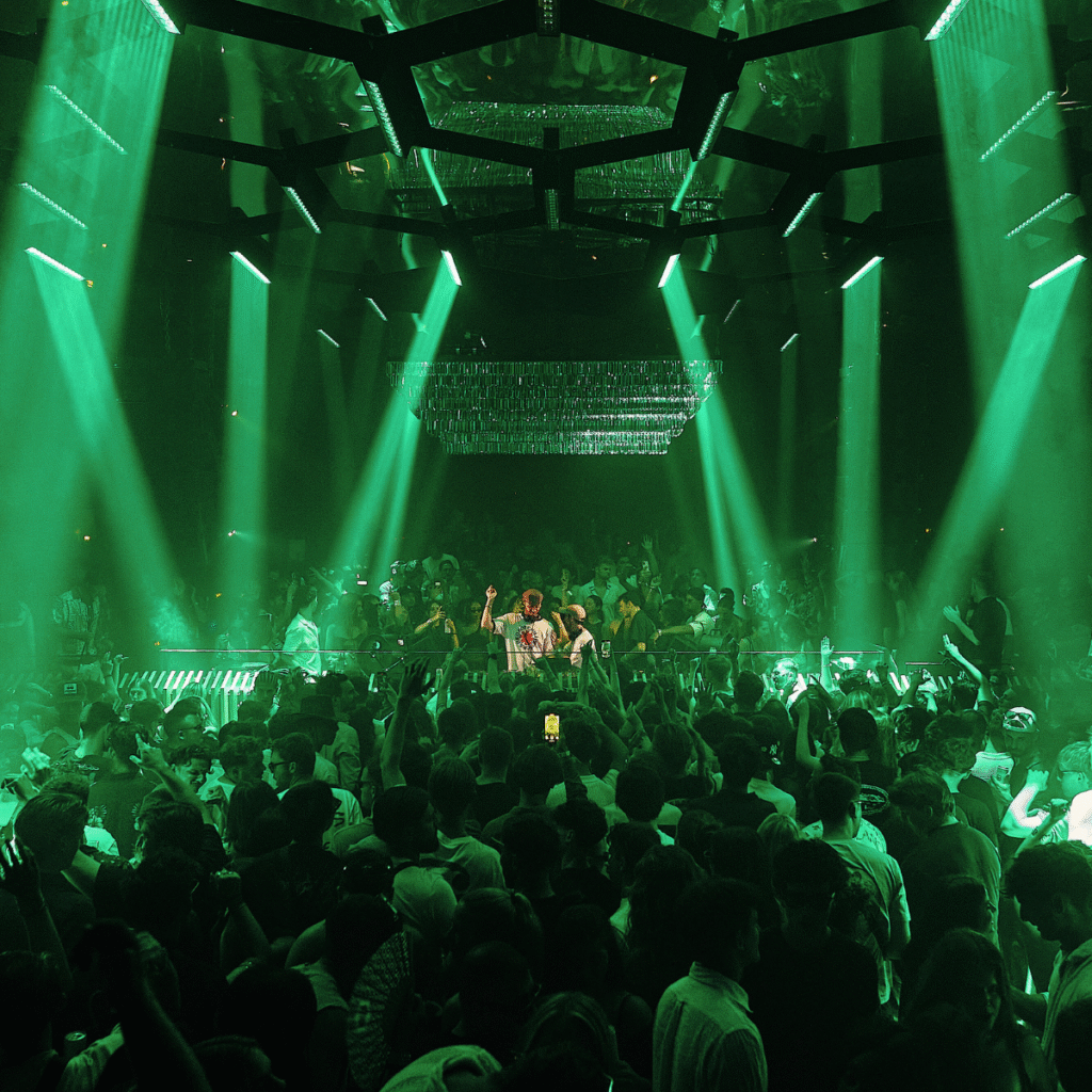 From the moment guests approach the venue, the experience unfolds like a fever dream. A monumental mirrored entrance multiplies reflections in prismic motion, blurring the line between reality and illusion. Silver twin cherries — the eternal symbol of Pacha’s hedonistic spirit — shimmer as sculptural icons, distorting the crowd into living art. Inside, the reinvention continues: the legendary hexagonal ceiling reborn as a reflective canopy, bending and multiplying light across the dancefloor, while semi-translucent panels stream visuals that dissolve the borders between DJ booth and crowd.