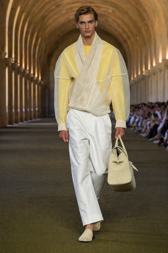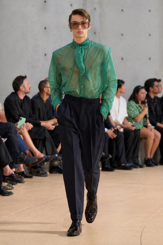 Transparency emerges as one of the most daring trends of the season. Sheer fabrics and lightweight materials reveal the body with subtlety, transforming traditional menswear into something more intimate and expressive.